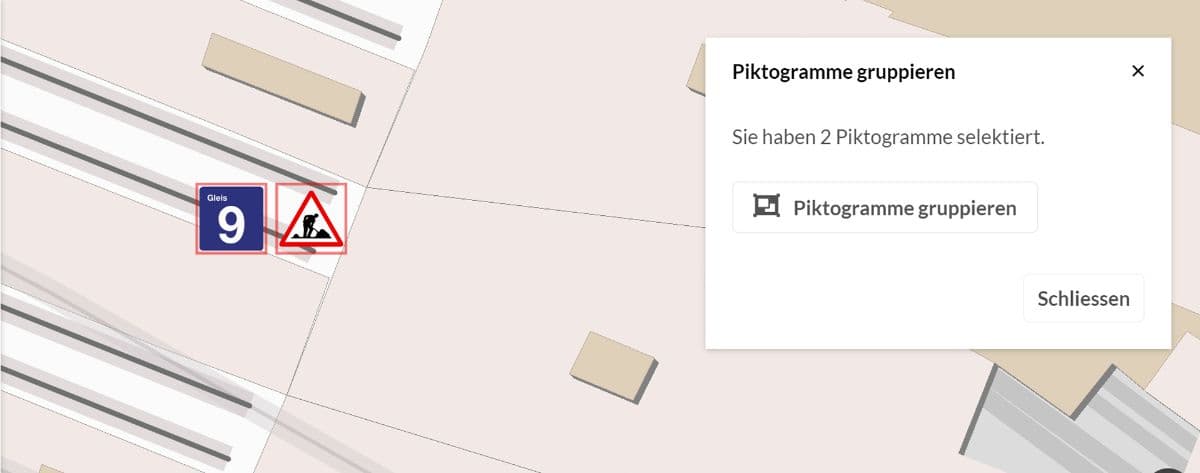 Wussten Sie, dass sich Piktogramme zu Gruppen zusammenfassen lassen? Die Funktion ist wichtig, wenn Piktogramme ihre relative Position zueinander beibehalten sollen, wenn die Karte gezoomt wird. Zum Gruppieren halten Sie die CTRL-Taste (Apfel-Taste bei Mac) gedrückt und klicken nacheinander die zu gruppierenden Piktogramme an. Darauf erscheint ein Dialog, mit dem die Gruppierung eingestellt werden kann. Wenn Sie eine Gruppe von Piktogrammen anklicken, erscheint direkt dieser Dialog, mit dem die Gruppierung rückgängig gemacht werden kann.