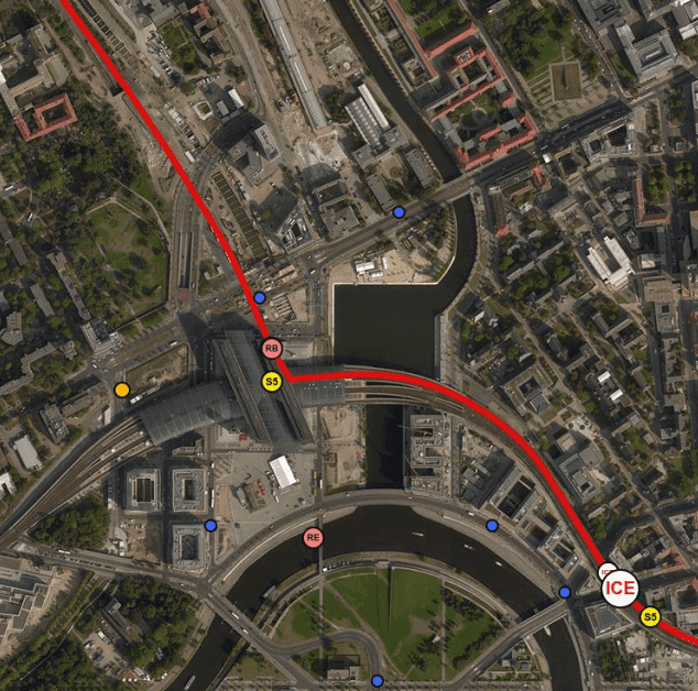 Der Kartenvergleich stützt das Verfahren der automatisierten Linienfindung. Wir möchten aber auch nicht verschweigen, dass es in manchen Fällen zu gröberen Fehlern kommen kann. In der Regel entstehen diese Fehler, wenn das Netzwerk, auf dem die Routenfindung aufsetzt, fehlerhaft ist. Da wir meist OpenStreetMap-Daten als Grundlage verwenden, können solche Fehler durch die Community selbst behoben werden, indem die Daten in OpenStreetMap korrigiert werden. Manche anderen Fehler entstehen aber auch, da unsere Heuristiken noch nicht alle Gegebenheiten berücksichtigen. Der Kartenausschnitt oben zeigt eine Kombination beider Fehlerquellen. Dass der ICE im Hauptbahnhof Berlin vom oberen Stockwerk ins Erdgeschoss fährt liegt zuerst einmal an einem falsch gesetzten Netzwerkknoten in OpenStreetMap. Andererseits sollten wir unsere Heuristik so erweitern, dass ICEs keine Treppen steigen und keine 90°-Wendungen vollziehen dürfen. Wir arbeiten laufend an Verbesserungen.